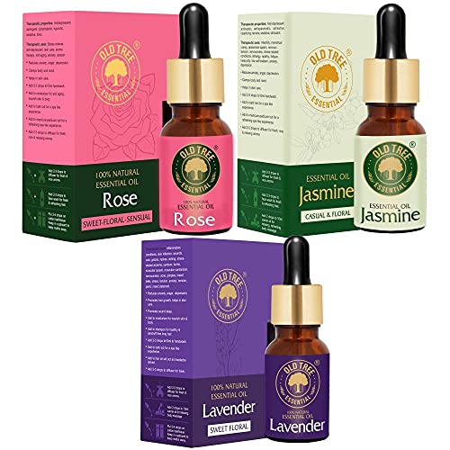 Old Tree Rose, Jasmine and Lavender Essential Oil Combo Pack (15ml each) – Pure, Natural and Undiluted Essential Oil with Glass Dropper for Fragrance, Diffuser, Skin, Hair,…