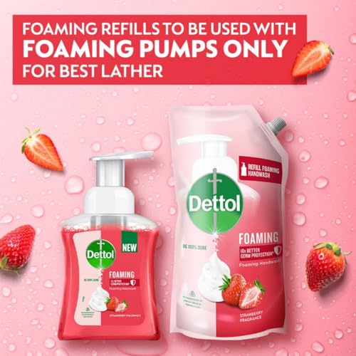 Technical Details, Be 100% sure to protect your skin from germs and bacteria. Dettol foaming handwash is a moisture-rich foam that removes dirt and germs while being gentle on skin. This hand wash provides soft and rich lather, leaving behind clean hands and mild strawberry fragrance. Dettol handwash is dermatologically tested. Dettol handwash are free from parabens/ TCC and are ph balanced.,