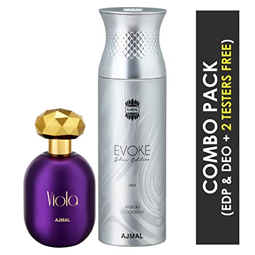 Specification: Ajmal Viola EDP Fruity Floral Perfume 75ml for Women and Evoke Silver Edition Him Deodorant Spicy Floral Fragrance 200ml for Men