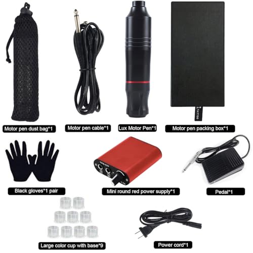 - PACKAGE INCLUDING: Full Set Tattoo Pen Kit, including tattoo pen, a pair of gloves,, power, paddle, power cable *2, storage bag, accessories.