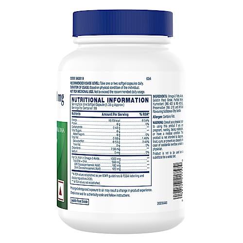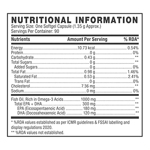 Technical Details, Fish oil is one of the richest sources of essential Omega-3 fatty acids. Regular intake of Omega-3 is highly recommended and beneficial in every stage of life. They can prevent serious health problems and complications and are also necessary for proper fetal brain and neurological development; hence its intake is significant during pregnancy. EPA (Eicosapentaenoic Acid) and DHA (Docosahexaenoic Acid), are the two main types of Omega-3 fatty acids present in fish oil. As per the Indian Council of Medical Research (ICMR), it is important to consume a minimum of 250mg to 2g of EPA and DHA daily to gain health benefits. Our diet often lacks the desired daily requirement of EPA and DHA and hence Omega-3 Fish Oil supplements become a convenient way to obtain them in desired amounts.,