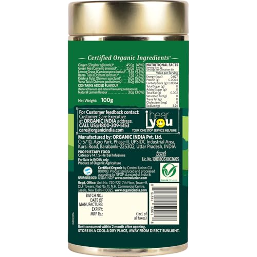Technical Details, Brimming with warming notes of Ginger and Tulsi, this aromatic blend gives you a soothing herbal embrace. This exquisite Green Tea accentuated with a natural lemon flavour is relaxation in a cup. Enjoy its rejuvenating effects with every sip!,