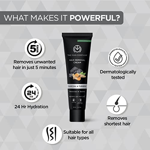 - REMOVES UNWANTED HAIR IN 5 MINUTES: The Man Company’s Dermatologically Tested Hair Removal Cream for men helps remove unwanted hair in 4-5 minutes with the power of charcoal and turmeric. If you have coarse hair, you can leave it on for up to 8 minutes, but not beyond that.