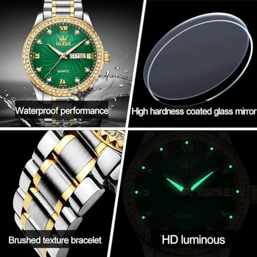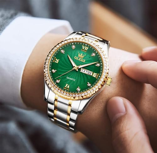 • Green Watches for Men Big Face ★ Classic Business Casual Dress Design ★ Stylish Golden bezel with neat firm diamonds, big face green dial with gold index (1.6″/40mm), fashion classic business style dress watches for men, Shiny hard wear-resistant adjustable Double butterfly clasp – Push Button Hidden Clasp, has been carefully designed to stand the test of time, So Handsome and Outstanding