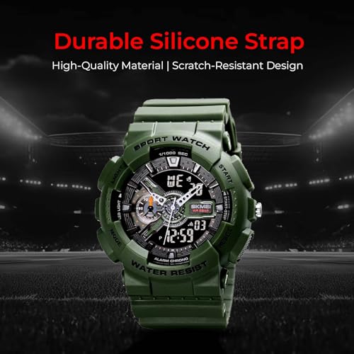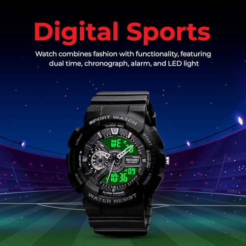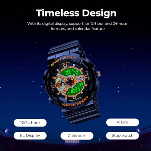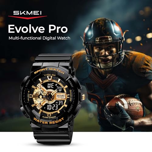 Specification: SKMEI Resin Men Digital Sports Watch, Led Square Large Face Analog Quartz Wrist Watch With Multi-Time Zone Waterproof Stopwatch, Gold Dial, Black Band